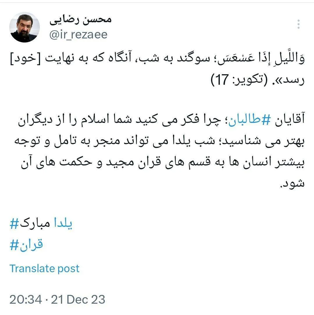 کلید واژه های مطلب: محسن رضایی ، توییت ، تبریک ، شب یلدا