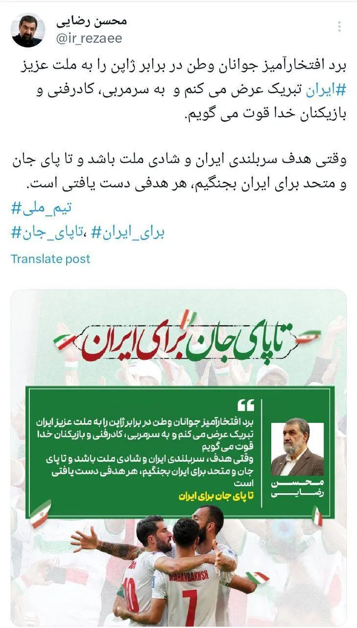 برد افتخارآمیز جوانان وطن در برابر ژاپن را به ملت عزیز ایران تبریک عرض می کنم و به سرمربی، کادرفنی و بازیکنان خدا قوت می گویم.