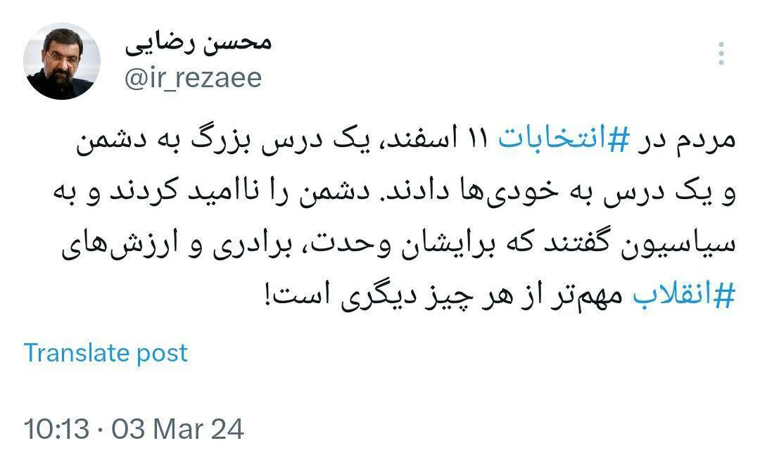 توییت دکتر محسن رضایی در واکنش به حضور مردم در انتخابات ۱۱ اسفند: