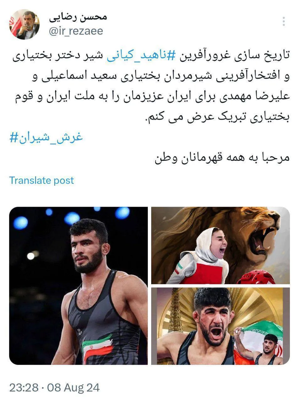 در پی کسب اولین مدال نقره تاریخ زنان ایران در المپیک توسط ناهید کیانی در رشته تکواندو و کسب مدال طلا توسط سعید اسماعیلی و کسب مدال نقره توسط علیرضا مهمدی در رشته کشتی فرنگی، دبیر شورایعالی هماهنگی اقتصادی سران قوا در توییتی کسب این افتخارات را به آنها تبریک گفت.