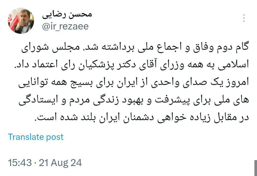 دکتر محسن رضایی در واکنش به رای اعتماد مجلس به همه وزرای پیشنهادی آقای پزشکیان در توییتی نوشت: