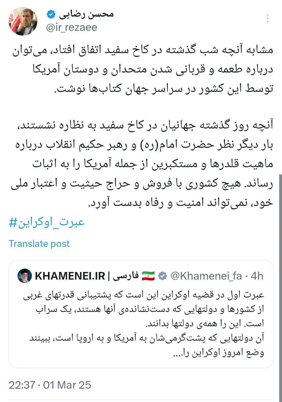 دکتر محسن رضایی در واکنش به اتفاقات حضور زلنسکی در کاخ سفید در توییتی نوشت: