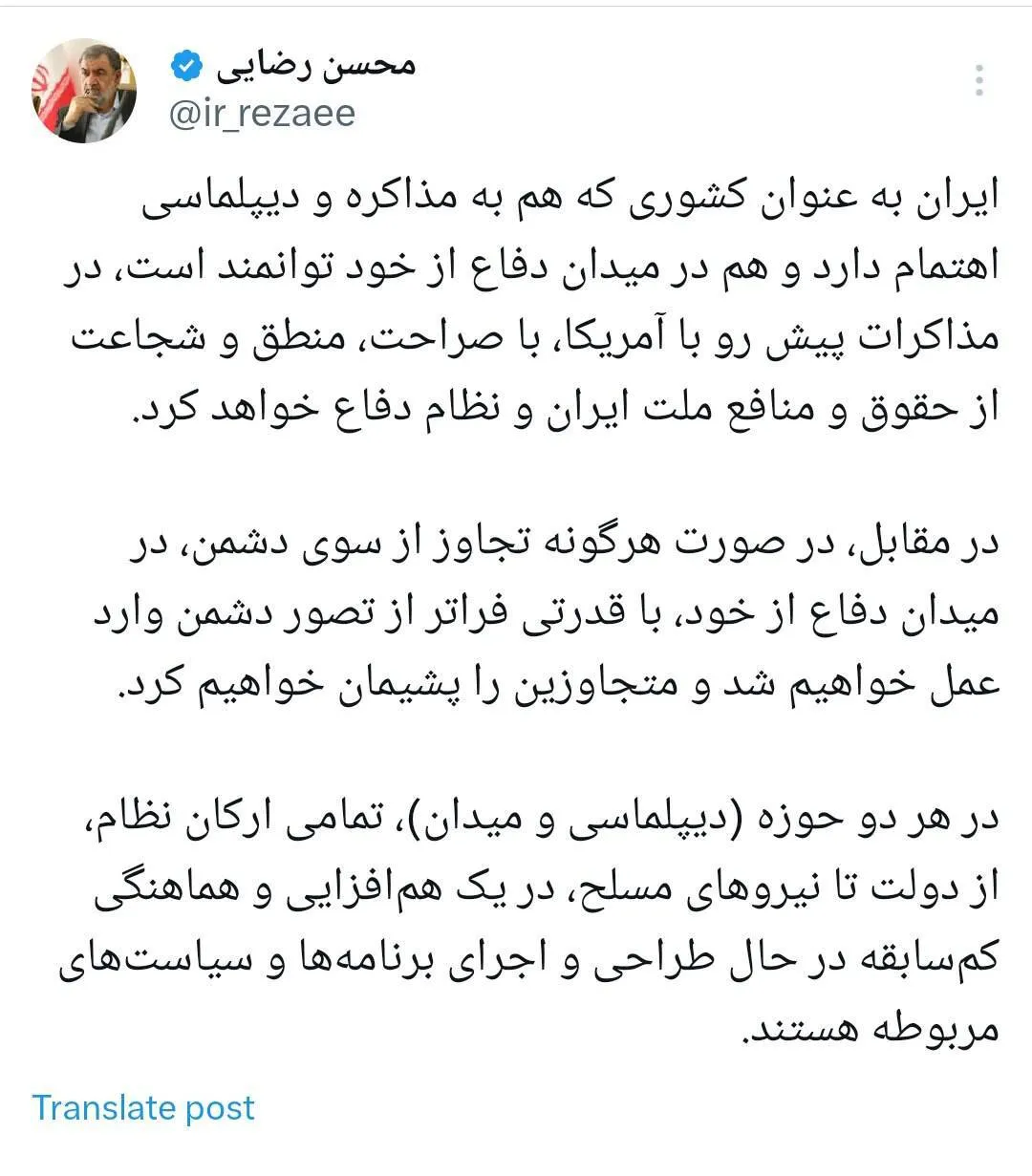 ایران به عنوان کشوری که هم به مذاکره و دیپلماسی اهتمام دارد و هم در میدان دفاع از خود توانمند است، در مذاکرات پیش رو با آمریکا، با صراحت، منطق و شجاعت از حقوق و منافع ملت ایران و نظام دفاع خواهد کرد.