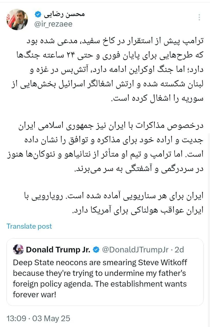 درخصوص مذاکرات با ایران نیز جمهوری اسلامی ایران جدیت و اراده خود برای مذاکره و توافق را نشان داده است. اما ترامپ و تیم او متأثر از نتانیاهو و نئوکانها هنوز در سردرگمی و آشفتگی به سر میبرند.