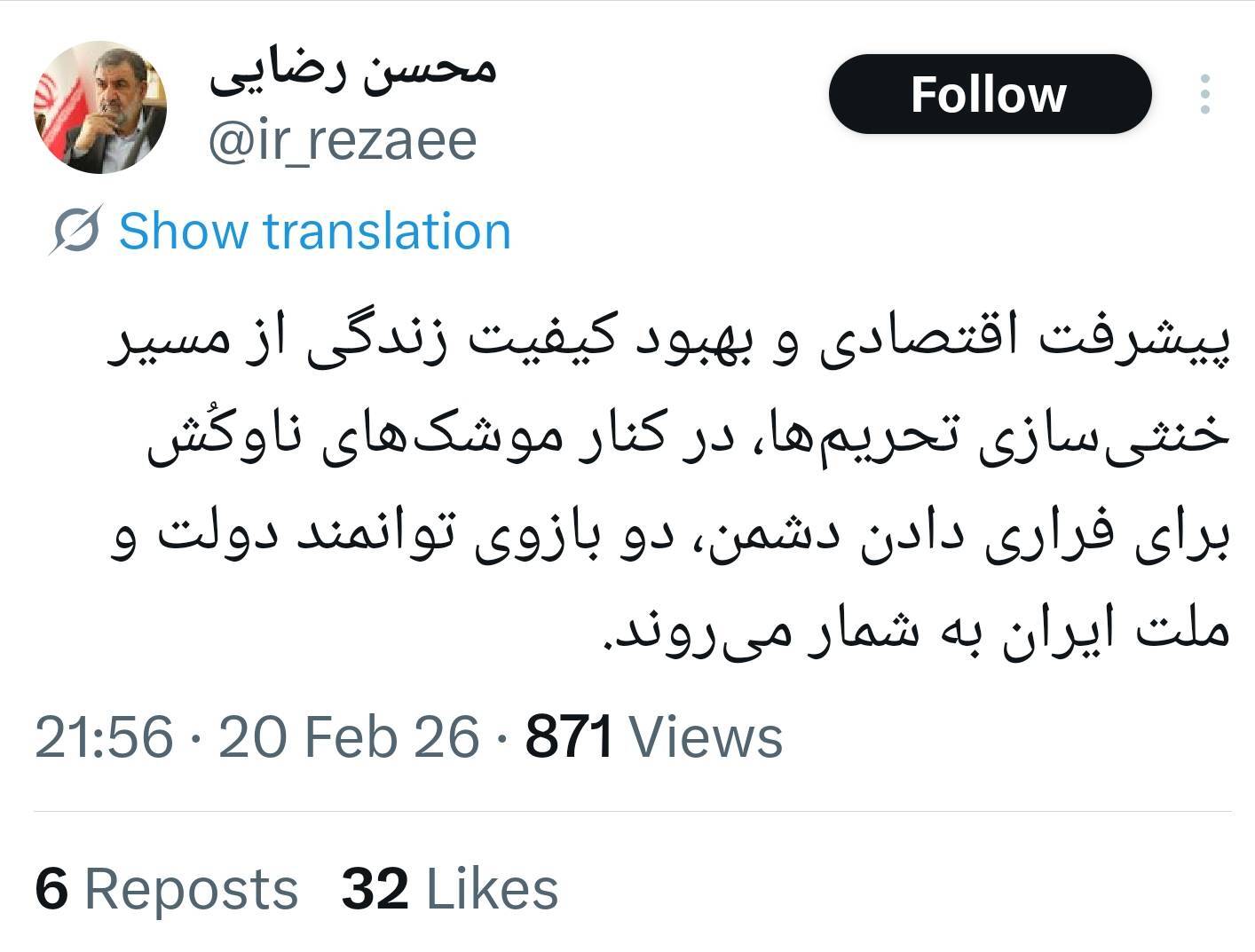 سردار سرلشکر محسن رضایی در پستی در شبکه اجتماعی ایکس نوشت:
